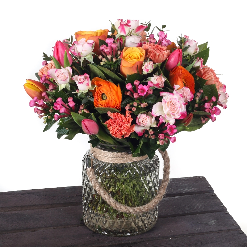 Luscious hand tied bouquet of vibrant orange ranunculus, orange roses,, orange carnations, two toned cerise spray roses, pink bouvardia, orange and cerise tulips.