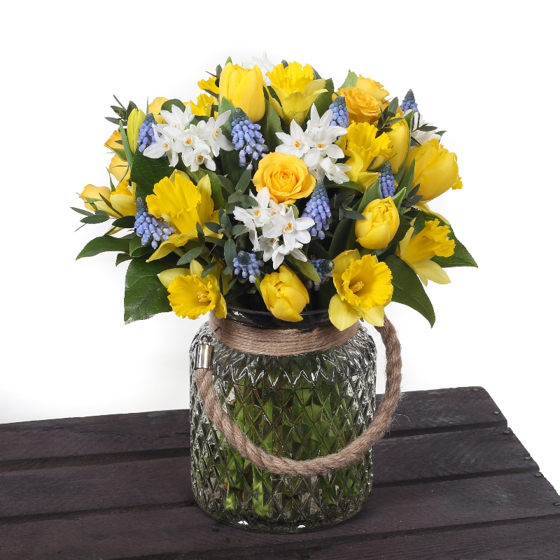 Spring hand tied of striking yellow daffodils, yellow tulips, white narcissus and dainty blue mascari.