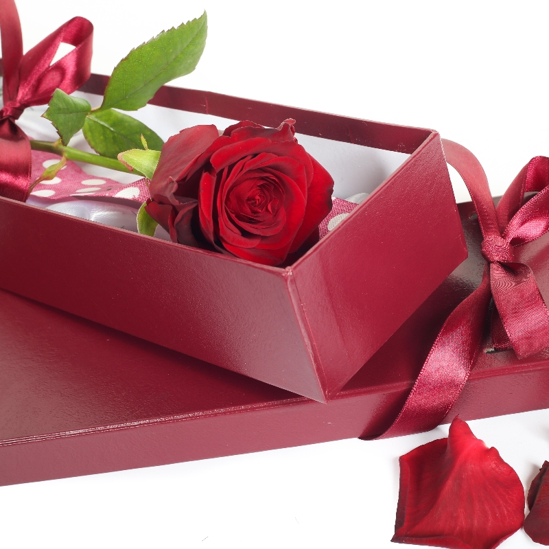 A beautiful red rose presented perfectly in a gift box. One rose for your one love.