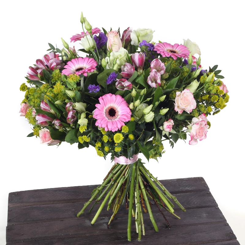 Mixed seasonal hand tied of pale pink germini, pink alstroemeria, green santini chrysanthemum, green lisianthus, purple limonium and pale pink roses.