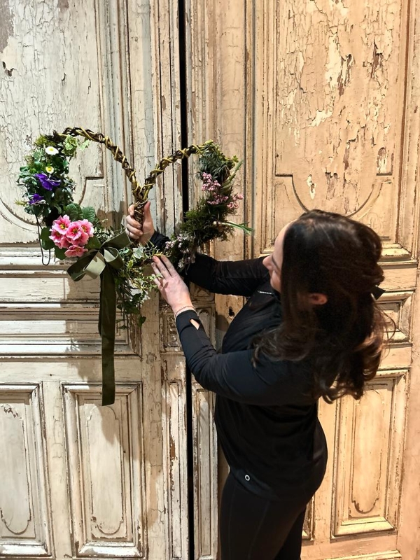 Handmade heart shaped wreath with a section of seasonal bulbs and plants that will grow on your door.